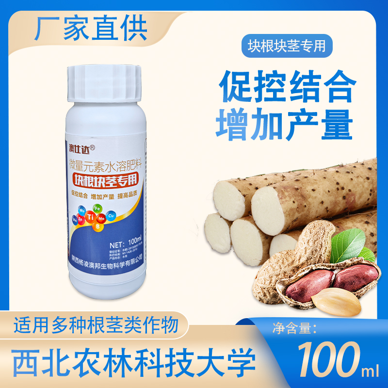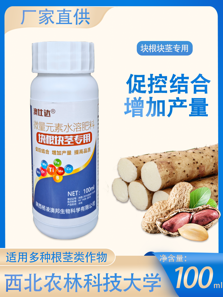 本产品是西北农林科技大学研制的一种新型根茎类作物营养调控剂。本品根据块根、鳞、球茎作物的生理、生物学性能,选用多种植物生长和化控物质,有效调控植物内源激素平衡,控制植物秧蔓徒长,提高单位叶片的光合作用能力和根系对营养的吸收能力,促进营养物质向根茎等贮能器官输送积累,加速根茎的细胞分裂等作用。