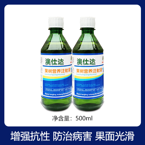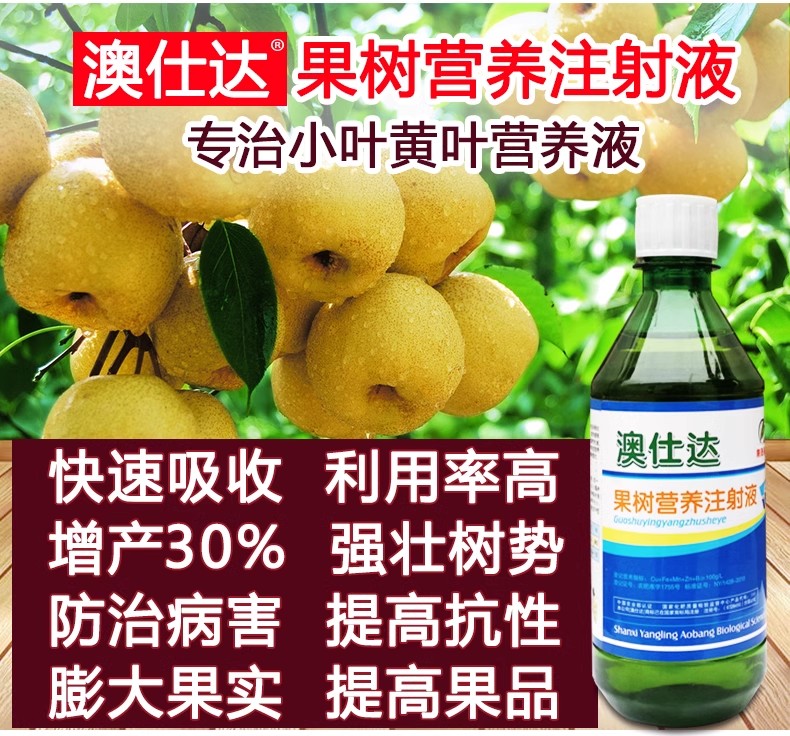 澳仕达果树营养注射液是西北农林科技大学专家根据我国南北方果树生长发育特性研制的一种全价营养液,该产品通过树干注射方法直接注入树体,能快速被果树吸收和利用,有效利用率高,减少当年肥料投入80%以上。本品对改善果树体质及防治因缺素引起的小叶、黄叶、丛枝等生理病害有及其显著的效果,同时大大提高和改善了果树的营养结构水平和生理调节机能,使果树叶片变绿、加厚、增大、极大的提高了叶片的光合作用;能激发根系的活性。使土壤中矿物质营养得到充分利用,促使果树树体有机营养的积累,强壮树势,增强树体抗寒、抗冻、抗病性。能有效抑制果树的根腐病、腐烂病和早期落叶病,促进果实膨果、着色、果形端正、果面光洁大幅提高果实商品率。奇特新颖的使用方法显著的产品效果堪称果业生产史上的又一次绿色革命。