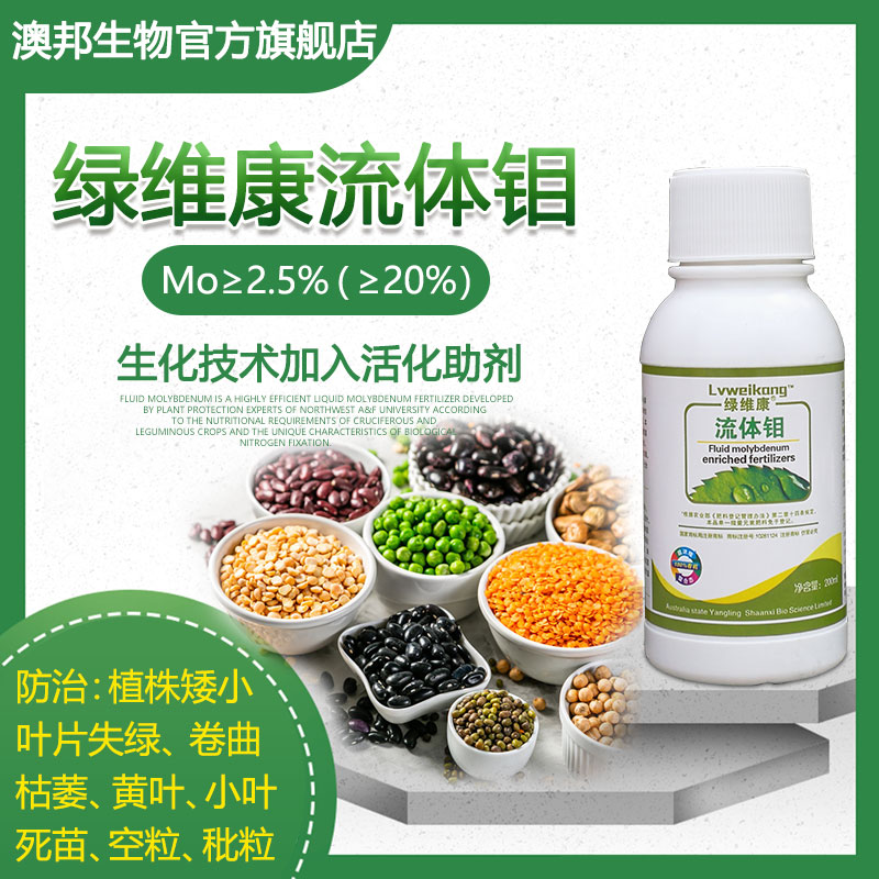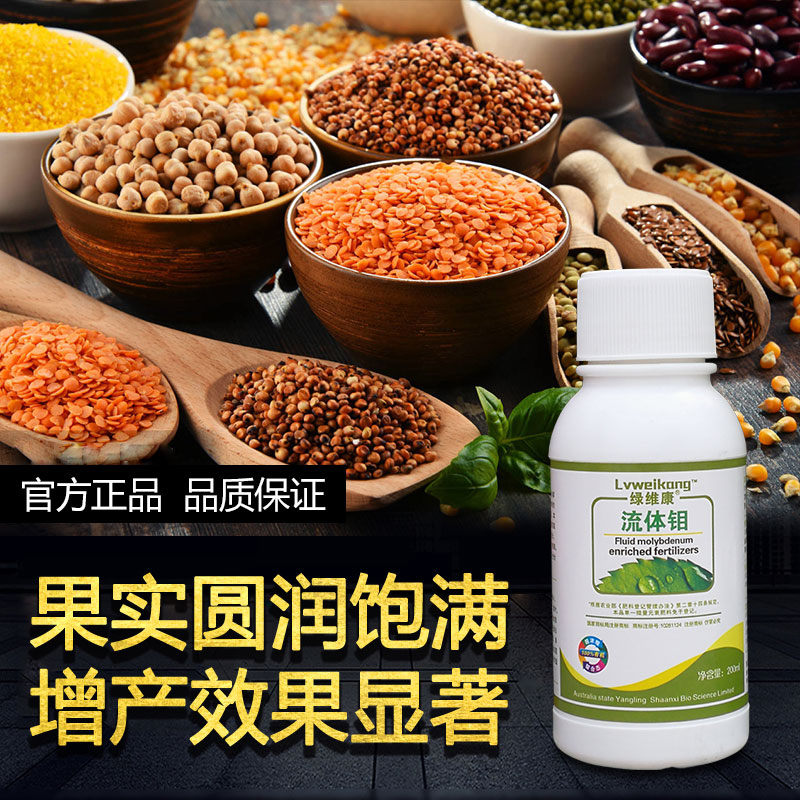 本品可有效防治因缺钼而引起的植株矮小、叶片失绿、卷曲、枯萎、根瘤发育不良、黄叶、小叶、死苗、空粒、秕粒等症状。促进生物固氮,显著提高根瘤菌的固氮能力,有利于蛋白质的合成,可使豆科植物的株高、分枝数、单株荚数、单荚粒数和种子千粒重增加,果实圆润饱满,其增产效果显著。